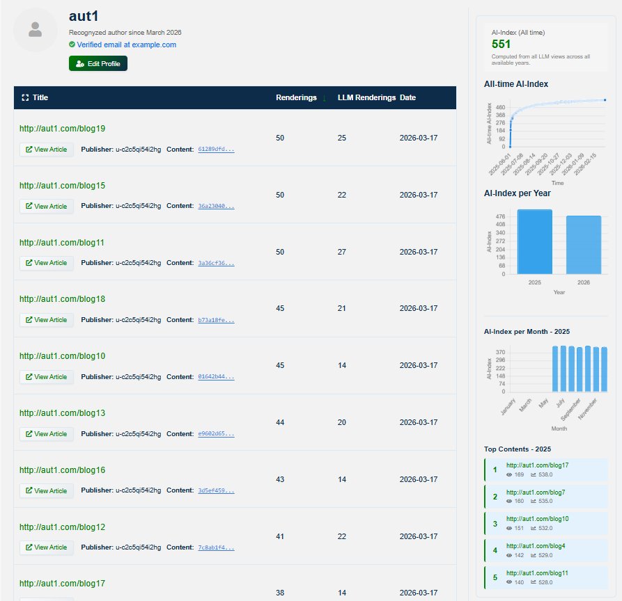 If you are a content publisher, you can select the Publisher menu at and register to get the monetary rewards for usage of your site by LLMs and other AI aggregators. In today's newsletter, we focus on another side: authors and their need for recognition. Do you have any content on the Web? If you do, you qualify as a Recognyze AI author.